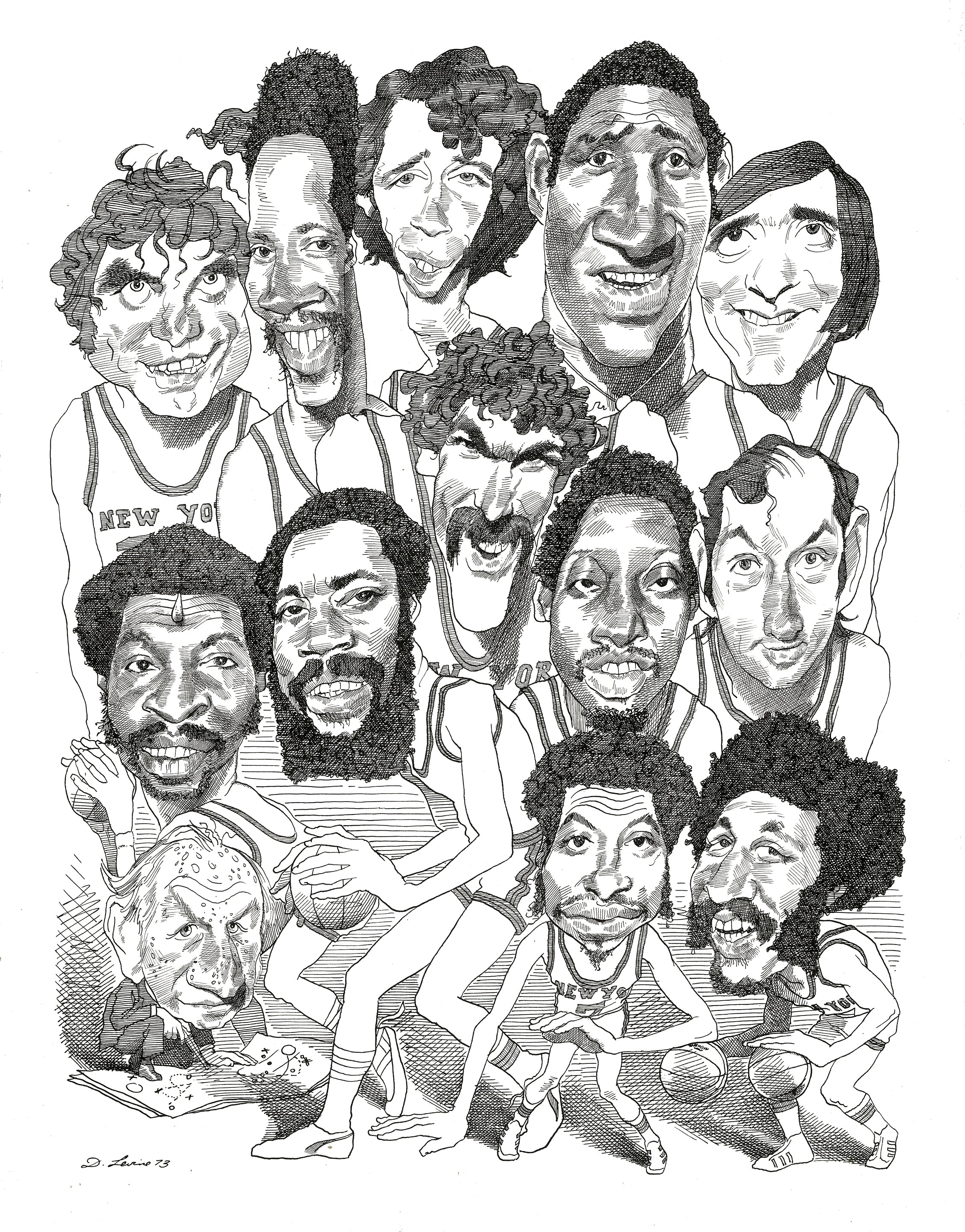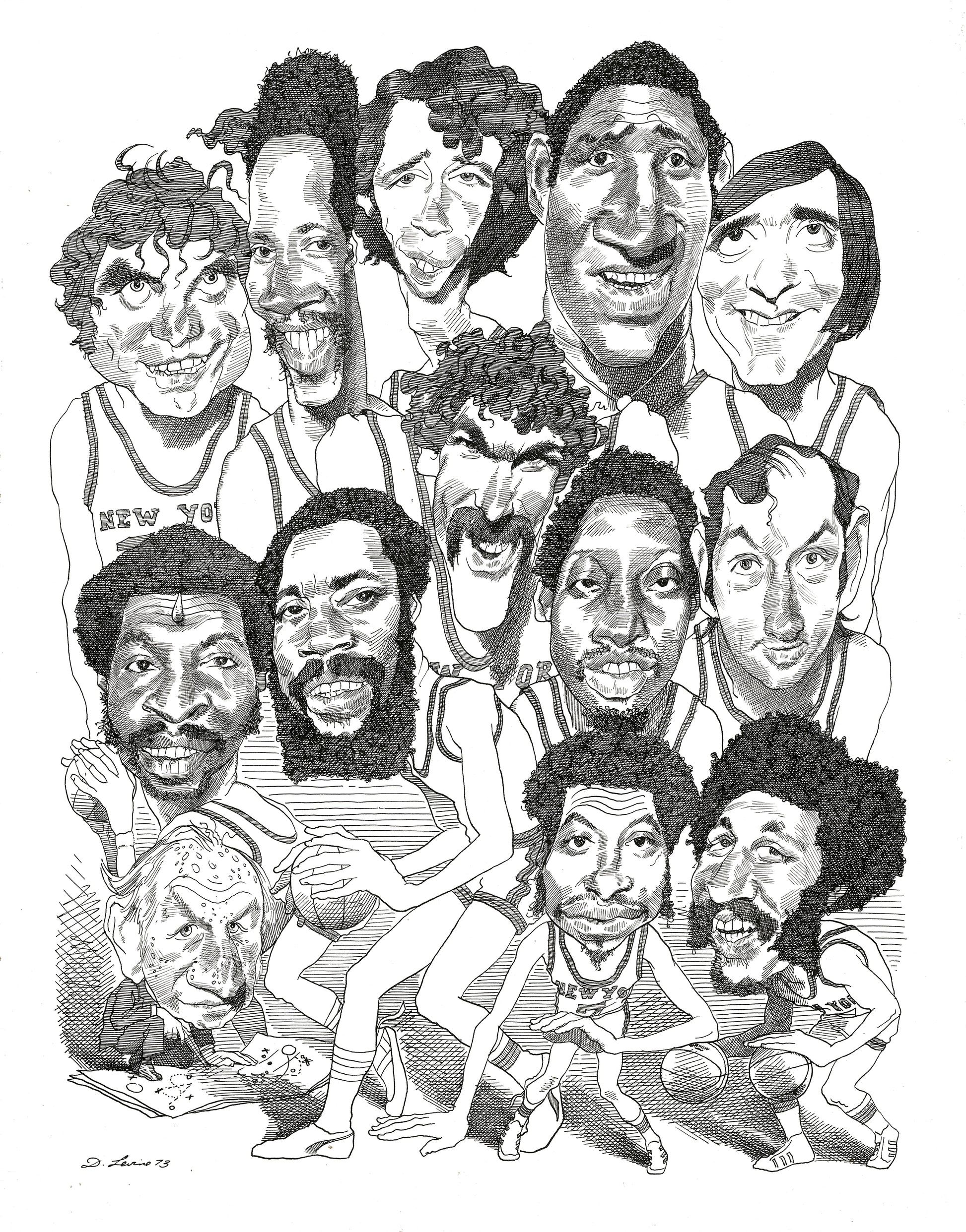 NY Knicks 1973 Championship Team by David Levine - Limited Edition Print